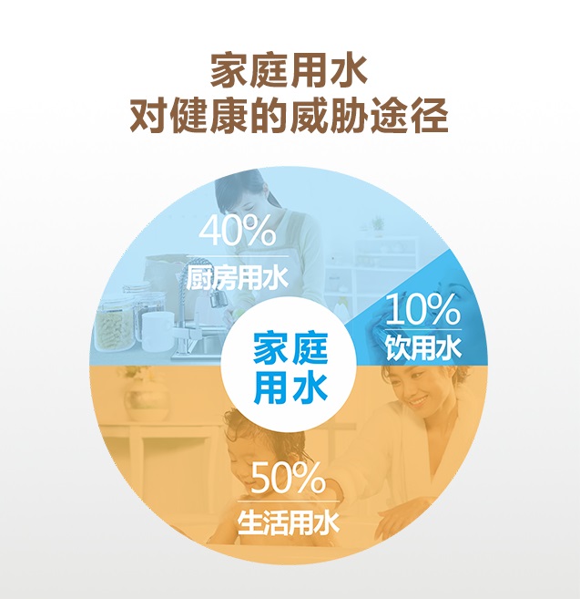 >全面净化家庭九成以上用水基础上(饮用水+厨房用水+生活用水),再高精度的净化饮用水。